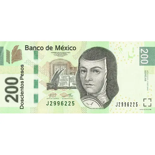 | Надписи лицевой стороны | Banco de México `Hombres necios que acusáis a la mujer sin razón, sin ver que sois la ocasión de lo mismo que culpáis` Sátira Filosófico 200 Doscientos Pesos 200 (Translation: Bank of Mexico, `Foolish men you accuse the woman for no reason, without seeing that you are the occasion of the same thing that you blame` Philosophical Satire, Two Hundred Pesos) |