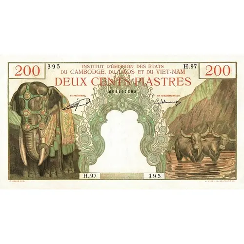 | Obverse lettering | Institut d’émission des états du Cambodge du Laos et du Viet-Nam P. JOUVE FEC. J. PIEL - G. BELTRAND SC. |