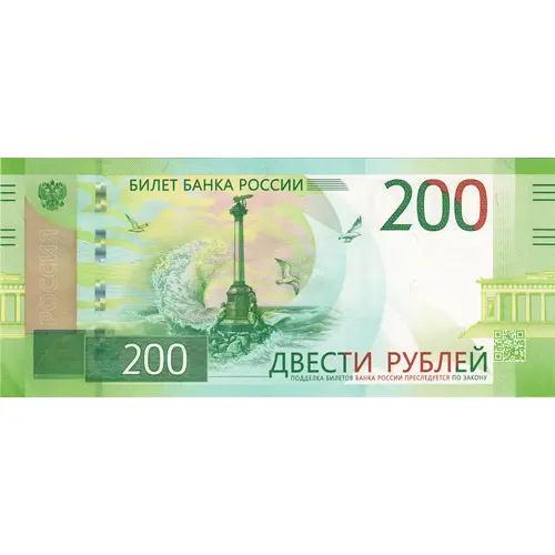 (Translation: Banknote of the Bank of Russia, Two Hundred Roubles, Forgery of banknotes of the Bank of Russia is prosecuted by law)