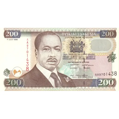 200 BANK KUU YA KENYA CENTRAL BANK OF KENYA HARAMBE LEGAL TENDER FOR TWO HUNDRED SHILLINGS SHILINGI MIA MBILI FOR THE BOARD OF DIRECTORS DANIEL TOROITICH ARAP MOI PRESIDENT OF THE REPUBLIC OF KENYA (Translation: Central Bank of Kenya All pull together Two hundred shillings) |