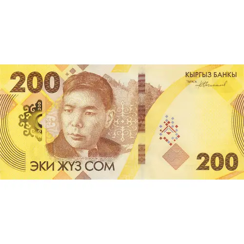 | Obverse lettering | 200 КЫРГЫЗ БАНКЫ ЭКИ ЖҮЗ СОМ 200 (Translation: Kyrgyz Bank, Two Hundred Som) |
