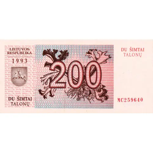 | نوشتههای روی اسکناس | LIETUVOS RESPUBLIKA 1993 200 DU ŠIMTAI TALONŲ (Translation: Republic of Lithuania 1993 200 Two Hundred Talonas) |