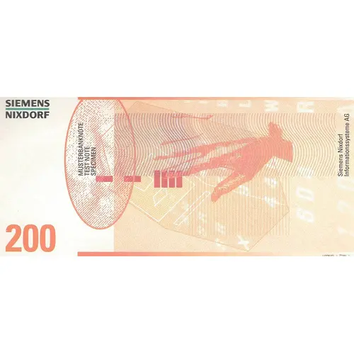 | 表面の銘文 | SIEMENS NIXDORF 200 MUSTERBANKNOTE TEST NOTE SPÉCIMEN Siemens Nixdorf Informationsysteme AG U23543-J-Z749-1 |