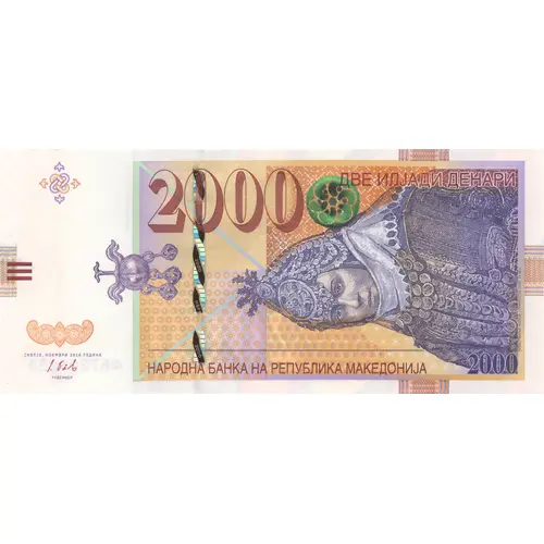 | Opis líce | 2000 ДВЕ ИЛЈАДИ ДЕНАРИ НАРОДНА БАНКА НА РЕПУБЛИКА МАКЕДОНИЈА (Translation: Two Thousand Denari National Bank of the Republic of Macedonia.) |