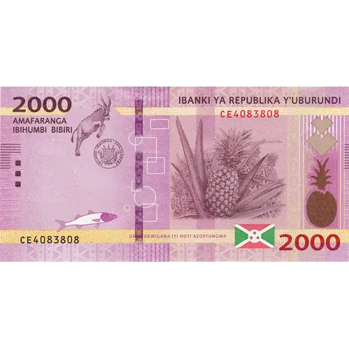 Obverse description Red, violet and green print; violet underprint, red and black serial numbers. Pineapple plant (Ananas comosus) and fruit at right, Kudu antelope (Tragelaphus sp.) leaping above the coat of arms of Burundi at upper left. Flag of Burundi at lower right. Windowed security thread with bank monogram and cow head. Fish-shaped see-through feature at lower left. Pineapple-shaped metallic foil at right.