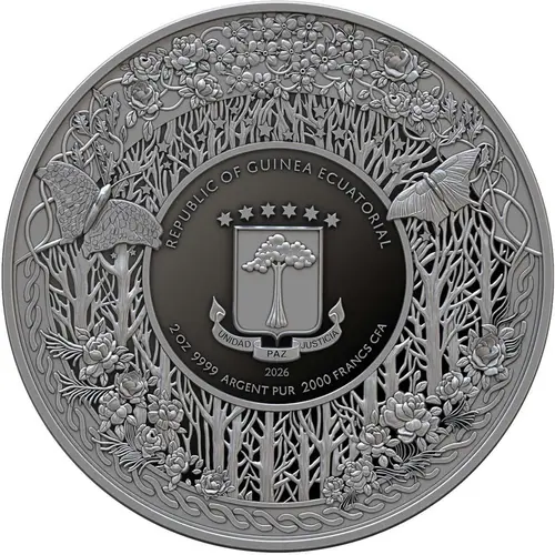 REPUBLIC OF GUINEA ECUATORIAL UNIDAD PAZ JUSTICIA 2026 2 OZ 9999 ARGENT PUR 2000 FRANCS CFA (Translation: Republic of Equatorial Guinea Unity Peace Justice 2 ounces 999.9 pure silver) |