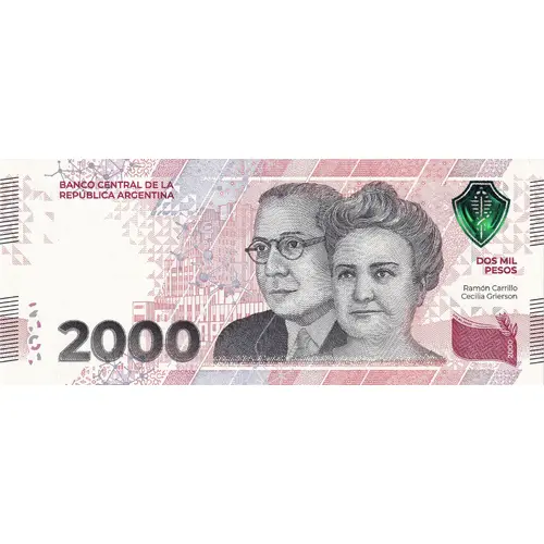 | Obverse lettering | BANCO CENTRAL DE LA REPÚBLICA ARGENTINA DOS MIL PESOS Ramón Carrillo Cecilia Crierson (Translation: CENTRAL BANK OF THE ARGENTINE REPUBLIC TWO THOUSAND PESOS Ramon Carrillo Cecilia Crierson) |