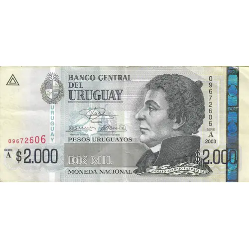 | 正面铭文 | On left: (serial numbers) SERIE A $ 2.000 On center: BANCO CENTRAL DEL URUGUAY (signatures) Gerente General Secretario General PESOS URUGUAYOS DOS MIL MONEDA NACIONAL DÁMASO ANTONIO LARRAÑAGA On right: (serial numbers, vertical) SERIE A 2003 $ 2.000 (Translation: On left: Series A $ 2,000 Uruguay On center: Central Bank of Uruguay General Manager General Secretary Pesos Uruguayos Two thousands National currency Dámaso Antonio Larrañaga On right: Series A 2003 $ 2,000) |