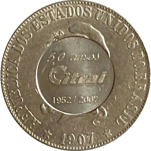| Ön yüz açıklaması | Legend in a circle: * REPUBLICA DOS ESTADOS UNIDOS DO BRASIL * 1907 (This legend is an integral part of the 2000 Réis coin - 1907 - KM# 508, which served as the basis for this piece). In the center stamped in circle, the following words (read from top to bottom): 50 anos Citral 1952/2002. |