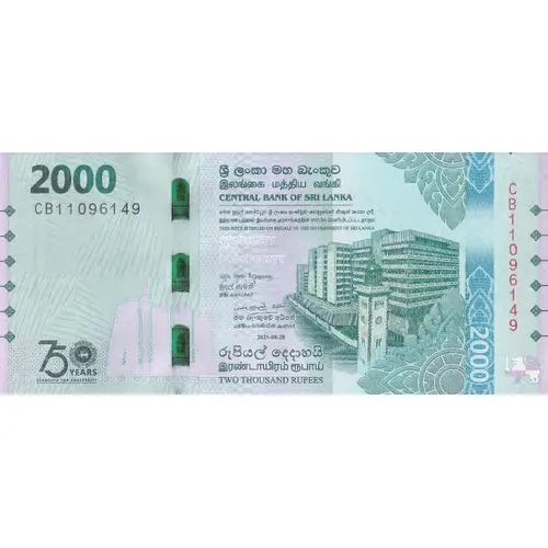 | Reverse description | The Central Bank of Sri Lanka (CBSL) issued a Rs. 2000 circulated commemorative currency note today to mark its 75th anniversary. The note is in line with the anniversary theme, “Stability for Prosperity,” reflecting the Central Bank’s enduring commitment to fostering economic stability as the foundation for national development. This is the 5th commemorative currency note issued by CBSL |