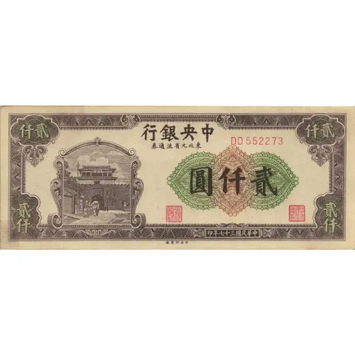 | Opis líce | 行銀央中 券通流省九北東 圓仟貳 印年七十三國民華中 (Translation: The Central Bank of China Circulation Notes in Northeastern 9 Provinces Two Thousand Yuan Printed in the 37th year of the Republic of China) |