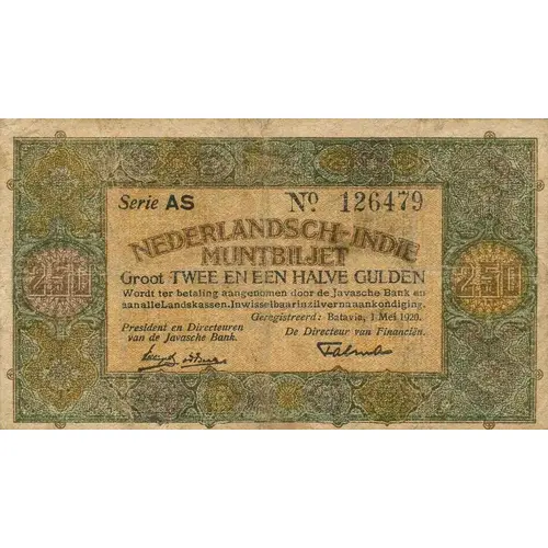 | Надписи лицевой стороны | NEDERLANDSCH-INDIE MUNTBILJET Groot TWEE EN EEN HALVE GULDEN Wordt in betaling hangenomen door De Javasche Bank en aan alle landskassen inwisselbaar in zilver na aankondiging. Geregistreerd: Batavia, 1 Mei 1920. (Translation: Netherlands Indies Coin Note Two and a Half Gulden Will be collected for payment by De Javasche Bank and can be exchanged for silver at all national treasuries after announcement. Registered: Batavia, May 1, 1920.) |