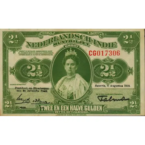 | Chữ khắc mặt trước | NEDERLANDSCH-INDIE MUNTBILJET Wordt in betaling hangenomen door De Javasche Bank en aan alle landskassen inwisselbaar in zilver na aankondiging. Geregistreerd: Batavia, 4 Augustus 1919. TWEE EN EEN HALVE GULDEN WETTIG BETAALMIDDEL AMERICAN BANK NOTE COMPANY. (Translation: Netherlands Indies Coin Note Will be collected for payment by De Javasche Bank and can be exchanged for silver at all national treasuries after announcement. Registered: Batavia, August 4, 1919. Two and a Half Gulden Legal Tender American Bank Note Company.) |