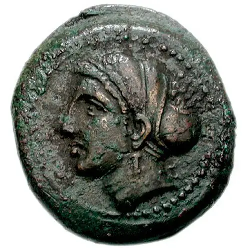 Reversbeschreibung Demeter seated left, holding grain ears with a herm at her feet