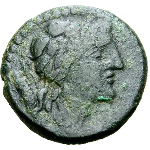 Descripción del anverso Laureate head of Apollo, bow and quiver over shoulder.