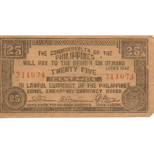 THE COMMONWEALTH OF THE PHILIPPINES WILL PAY TO THE BEARER ON DEMAND TWENTY FIVE CENTAVOS IN LAWFUL CURRENCY OF THE PHILIPPINES BOHOL EMERGENCY CURRENCY BOARD |