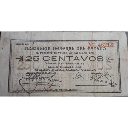 | Legenda do anverso | Tesoreria General del Estado El presente es valido al portador, por 25 centavos Chihuahua 10 de Diciembre de 1913 Gobernador provisional del estado GRAL. FRANCISCO VILLA IMP DEL GOBIERNO CHIHUAHUA (Translation: General State Treasury The present is valid to the bearer for 25 cents Chihuahua December 10, 1913 Interim Governor of the State Gen. Francisco Villa Chihuahua Government Printer) |