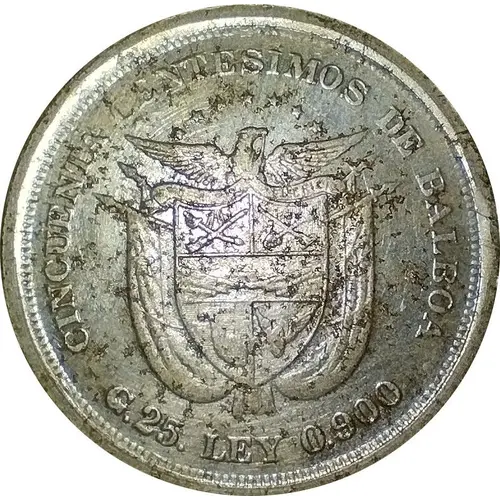 | Obverse lettering | VEINTICINCO CENTESIMOS DE BALBOA ******* PRO MUNDI BENEFICIO G.12.500 LEY 0.900 (Translation: Twenty-Five Centesimos of a Balboa For the benefit of the World 12.5 grams 0.900 fine) |