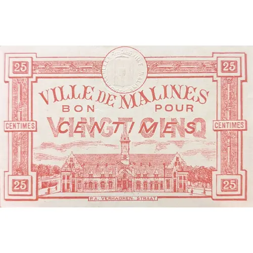 VILLE DE MALINES - BON POUR 25 CENTIMES - P.A. VERHAGHENSTRAAT (Translation: STAD MECHELEN - GOOD FOR 25 CENTS - P.A VERHAGEN STREET) |