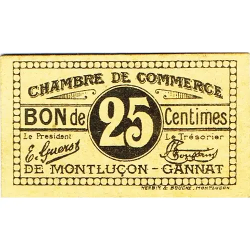 | 表面の銘文 | CHAMBRE DE COMMERCE BON de 25 Centimes DE MONTLUÇON - GANNAT Le Président Le Trésorier HERBIN & BOUCHÉ _ MONTLUCON _ |