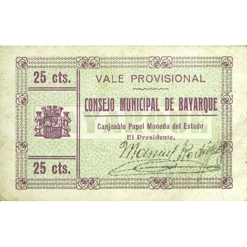25 cts. VALE PROVISIONAL CONSEJO MUNICIPAL DE BAYARQUE Canjeable Papel Moneda del Estado (Translation: 25 Centimos Provisional Voucher Municipal Council of Bayarque Redeemable State Paper Money) |