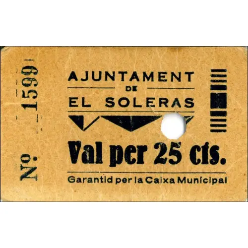 | Надписи лицевой стороны | AJUNTAMENT DE EL SOLERAS Val per 25 cts. Garantid per la Caixa Municipal (Translation: City Council of El Soleràs Valid for 25 Centimos Guaranteed by the `Caixa Municipal`) |