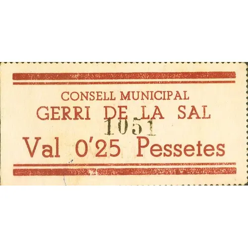 | Obverse lettering | CONSELL MUNICIPAL GERRI DE LA SAL Val 0`25 Pessetes (Translation: Municipal Council Gerri de la Sal Value 0.25 Pesetas) |