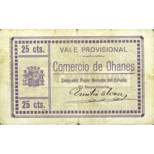 25 cts. VALE PROVISIONAL Comercio de Ohanes Canjeable Papel Moneda del Estado (Translation: 25 Centimos Provisional Voucher Commerce of Ohanes Redeemable State Paper Money) |