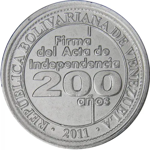| نوشتههای روی سکه | REPÚBLICA BOLIVARIANA DE VENEZUELA Firma Del Acta de Independencia 200 años 2011 (Translation: Bolivarian Republic of Venezuela Signing of the Independence act 200 years 2011) |