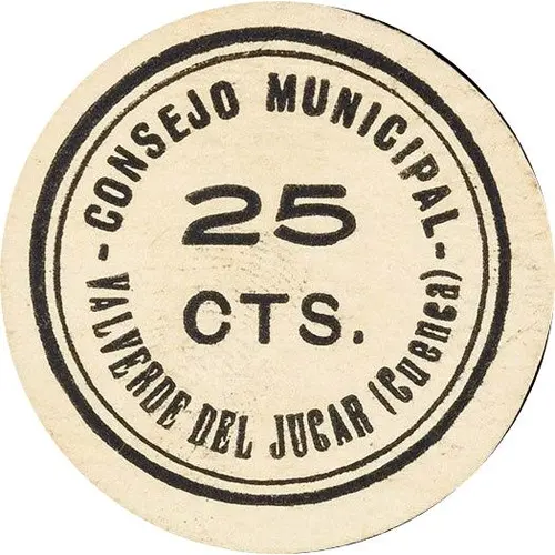 | Legenda del dritto | CONSEJO MUNICIPAL 25 CTS. - VALVERDE DEL JUCAR (Cuenca) - (Translation: Municipal Council 25 Centimos) |
