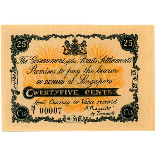 25 25 The Government of the Straits Settlements Promises to pay the bearer ON DEMAND at Singapore TWENTYFIVE CENTS Local Currency for Value received Ag. Treasurer CTS CTS |