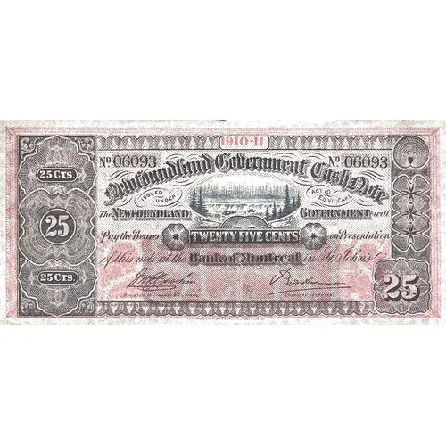 | Chữ khắc mặt trước | 1911-12 25 25 CTS. - 25 - 25 CTS. Newfoundland Government Cash Note ISSUED UNDER - ACT 10 ED. VII CAP 1 The NEWFOUNDLAND - GOVERNMENT will Pay the Bearer - TWENTY FIVE CENTS - on Presentation of this note at the Bank of Montreal in St. John`s MINISTER OF FINANCE & Customs - COLONIAL SECRETARY 25 WHITEHEAD, MORRIS & Co. LD ENGRAVERS, LONDON. |