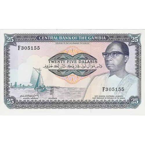 | Obverse lettering | Central Bank of the Gambia Promise to pay on demand the sum of Twenty Five Dalasis Sir Dawda Kairaba Jawara First President of Republic of the Gambia |
