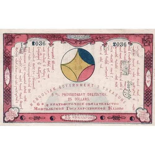 | Opschrift voorzijde | ᠮᠣᠩᠭᠣᠯ ᠤᠯᠤᠰ ᠤᠨ ᠰᠠᠩ ᠠᠴᠠ ᠣᠯᠠᠨᠠ ᠡᠷᠭᠦᠭᠳᠡᠭᠰᠡᠨ ᠦ ᠠᠷᠪᠠᠨ ᠨᠢᠭᠡᠳᠦᠭᠡᠷ ᠣᠨ ᠠᠷᠪᠠᠨ ᠰᠠᠷᠠ ᠶᠢᠨ ᠬᠣᠷᠢᠨ ᠬᠦᠷᠲᠡᠯᠡ ᠬᠡᠮᠡᠬᠦ ᠬᠤᠭᠤᠴᠠᠭᠠ ᠪᠠᠷ ᠭᠠᠷᠭᠠᠭᠰᠠᠨ ᠪᠦᠭᠦᠳᠡ ᠨᠢᠭᠡᠨ ᠵᠠᠭᠤᠨ ᠬᠤᠪᠢ ᠠᠴᠠ ᠵᠢᠷᠭᠤᠭᠠᠨ ᠬᠤᠪ ᠤᠨ ᠬᠡᠦ ᠦᠷᠡᠵᠢᠭᠦᠯᠵᠦ ᠪᠦᠬᠦᠢ ᠪᠠᠭᠠ ᠪᠣᠯᠵᠣᠭᠠᠲᠤ ᠪᠠᠲᠤᠯᠠᠭᠠᠨ ᠤ ᠲᠡᠮᠳᠡᠭ᠃ ᠡᠨᠡᠬᠦ ᠪᠠᠲᠤᠯᠠᠭᠠᠨ ᠤ ᠲᠡᠮᠳᠡᠭ ᠢ ᠲᠤᠰᠢᠶᠠᠭᠰᠠᠨ ᠬᠦᠨᠳᠦ ᠤᠭ ᠲᠣᠭᠲᠠᠭᠰᠠᠨ ᠪᠣᠯᠵᠣᠭᠠ ᠰᠠᠩ ᠤᠨ ᠶᠠᠮᠤᠨ ᠠᠴᠠ ᠠᠷᠪᠠᠨ ᠶᠠᠩᠴᠢᠶᠠᠨ ᠤ ᠪᠡᠯᠡᠨ ᠮᠥᠩᠭᠥᠨ ᠦ ᠵᠦᠢᠯ ᠢ ᠭᠦᠢᠴᠡᠳᠭᠡᠨ ᠲᠥᠯᠮᠣᠢ᠃ ᠡᠭᠦᠨ ᠦ ᠲᠤᠯᠠ ᠭᠠᠷ ᠤᠨ ᠵᠢᠷᠤᠭ ᠲᠠᠯᠪᠢᠭᠰᠠᠨ ᠰᠠᠩ ᠤᠨ ᠶᠠᠮᠤᠨ ᠤ ᠲᠡᠷᠢᠭᠦᠨ ᠰᠠᠶᠢᠳ᠃ ᠰᠠᠩ ᠤᠨ ᠶᠠᠮᠤᠨ ᠤ ᠵᠦᠪᠳᠡᠬᠦ ᠲᠦᠰᠢᠮᠡᠯ᠃ ᠨᠡᠶᠢᠰᠯᠡᠯ ᠬᠦᠷᠢᠶᠡ᠃ ᠣᠯᠠᠨᠠ ᠡᠷᠭᠦᠭᠳᠡᠭᠰᠡᠨ ᠦ ᠠᠷᠪᠠᠨ ᠨᠢᠭᠡᠳᠦᠭᠡᠷ ᠣᠨ᠂ ᠳᠥᠷᠪᠡᠨ ᠰᠠᠷᠠ ᠶᠢᠨ ᠬᠣᠷᠢᠨ ᠅ MONGOLIAN GOVERNMENT`S TREASURE. 6 % PROVISIONARY OBLIGATION. 25 DOLLARS 6 % КРАТКОСРОЧНОЕ ОБЯЗАТЕЛЬСТВО МОНГОЛЬСКИЙ ГОСУДАРСТВЕННОЙ КАЗНЫ 25 ДОЛЛАРОВЪ (Translation: 6% short-term commitment to the Mongol State Treasure, 25 Dollars) |