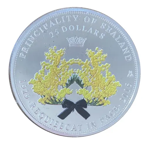 | Obverse lettering | PRINCIPALITY OF SEALAND 25 DOLLARS 1929 · REQUIESCAT IN PACE · 2016 (Translation: Rest in peace) |