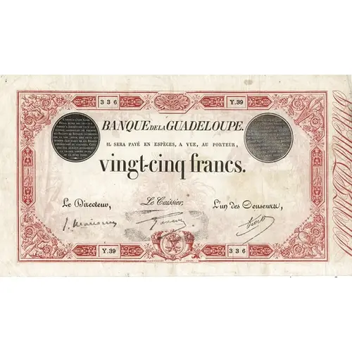 | Legenda del dritto | BANQUE de la GUADELOUPE IL SERA PAYE EN ESPÈCE, A VUE, AU PORTEUR vingt-cinq francs. CORNOUAILLES FECIT. (Translation: Bank of Guadeloupe will pay in cash to bearer Twenty-Five Francs) |