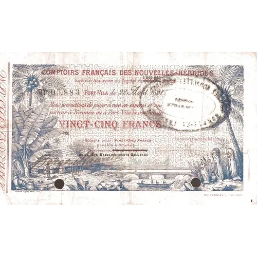 COMPTOIRS FRANÇAIS DES NOUVELLES-HÉBRIDES Société Anonyme au Capital de 3.000.000 Francs PORT-VILA, le 22 Août 1921. Nous promettons de payer a vue en espéces et au porteur à Nouméa on à Port-Vila la somme de VINGT-CINQ FRANCS Accept peur VINGT-CINQ FRANCS payable a Nouméa HENRY COND`AMIN, INV. Imp. CHAIX. Paris 3481 - 1908 (Translation: French Counters in the New Hebrides Société Anonyme with Capital of 3,000,000 Francs Port-Vila, August 22, 1921. We promise to pay on sight in cash and at carrier in Nouméa or in Port-Vila the sum of Twenty-five Francs. Accept for Twenty-five Francs payable in Nouméa.) |