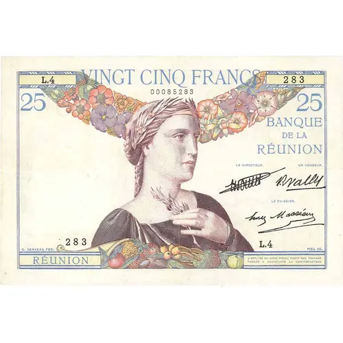 | نوشتههای پشت اسکناس | 25 VINGT CINQ FRANCS BANQUE DE LA RÉUNION CL SERVEAU DEL HOURRIEZ SC (Translation: 25 Twenty-Five Francs Bank of Reunion) |