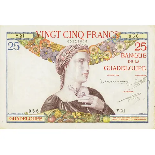| نوشتههای پشت اسکناس | 25 VINGT CINQ FRANCS BANQUE DE LA GUADELOUPE CL SERVEAU DEL HOURRIEZ SC (Translation: 25 Twenty-Five Francs Bank of Guadeloupe) |