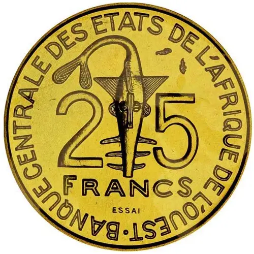 | Legenda do anverso | 25 FRANCS BANQUE CENTRALE DES ETATS DE L`AFRIQUE DE L`OUEST ESSAI (Translation: Central Bank of [the] West African States Trial) |