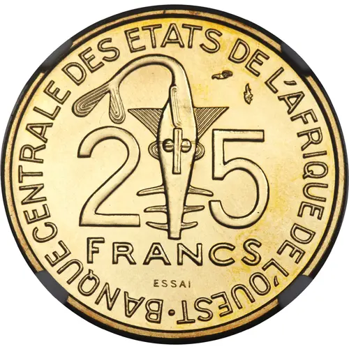 | Legenda del dritto | 25 FRANCS ESSAI BANQUE CENTRALE DES ETATS DE L`AFRIQUE DE L`OUEST (Translation: Trial Central Bank of [the] West African States) |