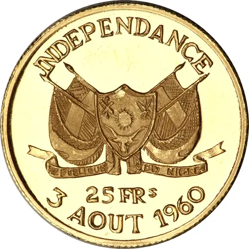 | Ön yüz lejandı | INDEPENDANCE REPUBLIQUE DU NIGER 25 FRs 3 AOUT 1960 (Translation: Independence. Republic of Niger. August 3rd, 1960.) |