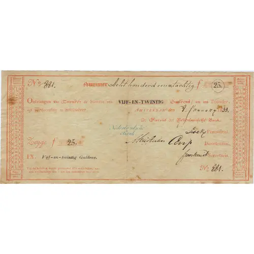 | Obverse lettering | NEDERLANDSCHE BANK. Ontvangen van Toonder de Somma van VIJF-EN-TWINTIG Guldens / om aan Toonder, op vertooning te restituëren. Amsterdam, den 8 January 1833. Nederlandsche-Bank 1814. President - Directeur - Secretaris Legge f 25. IX. Vijf-en-Twintig Guldens. (Translation: Bank of Netherlands. Received from Bearer the Somma of a Twenty Five Guilders, to restimese to Bearer upon presentation. Amsterdam, the January 8, 1833. Bank of Netherlands 1814. President - Director - Secretary 25) |