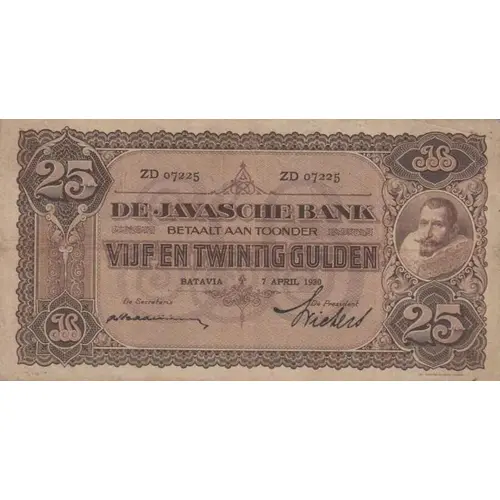 | Leyenda del anverso | DE JAVASHE BANK BETAALT AAN TONDER VIJF EN TWINTIG GULDEN Batavia 7 April 1930 JOH ENSCHEDÉ EN ZONEN (Translation: The Javanese Bank Pay to the Bearer Twenty Five Gulden Batavia April 7, 1930 Joh. Enschedé and Sons) |