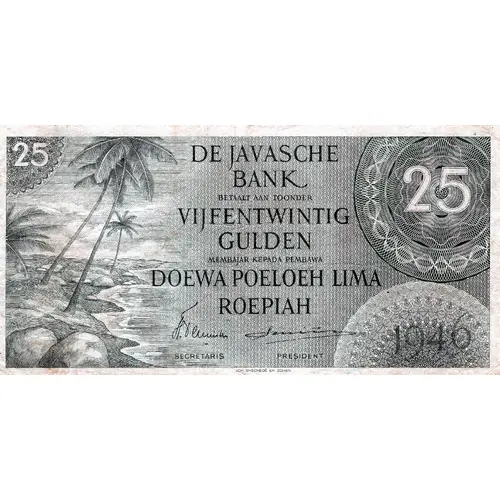 | Legenda awersu | De Javasche Bank Betaalt aan Toonder Vijfentwintig Gulden Membajar Kepada Pembawa Doewa Poeloeh Lima Roepiah |