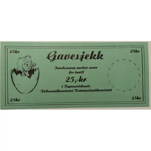 | نوشتههای روی اسکناس | 25kr Gavesjekk Innehaveren mottar varer for inntil 25,- kr i Tegneseriehuset, Fellesantikvariatet/Kriminalantikvariatet (Translation: Gift voucher. The holder receives goods for up to 25,- kr. at Tegneseriehuset, Fellesantikvariatet/Kriminalantikvariatet.) |