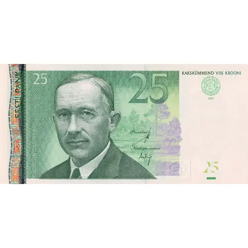 | Opis líce | EESTI PANK 25 KAKSKÜMMEND VIIS KROONI (Translation: Bank of Estonia, Twenty-five Kroon) |
