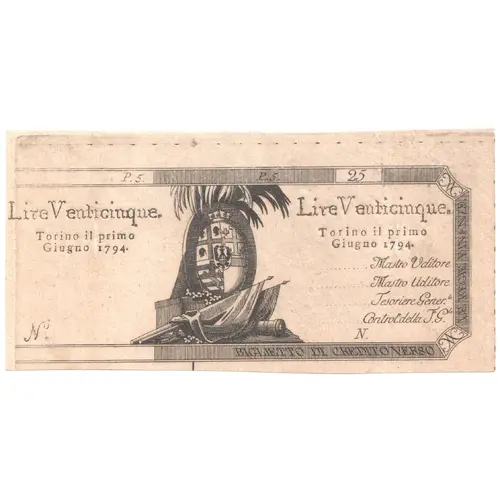 | Legenda del dritto | Lire Venticinque Torino il primo Giugno 1794 |