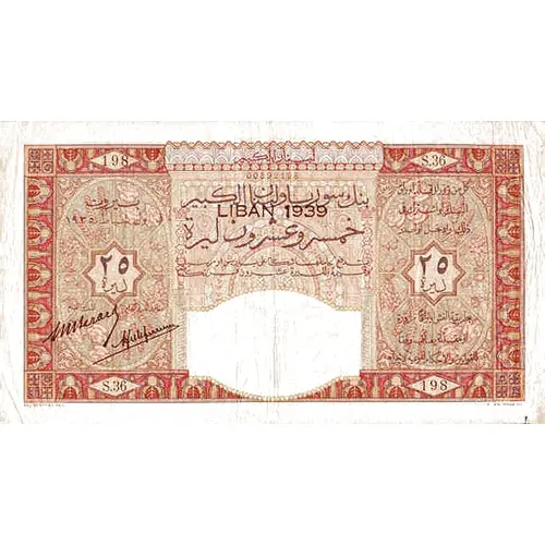 | Надписи оборотной стороны | GRAND-LIBAN BANQUE DE SYRIE ET DU GRAND-LIBAN VINGT CINQ LIVRES REMBOURSABLE AU PORTEUR EN CHÈQUE SUR PARIS OU MARSEILLE À RAISON DE VINGT FRANCS LA LIVRE CL. SERVEAU FEC. E. DELOCHE SC. |