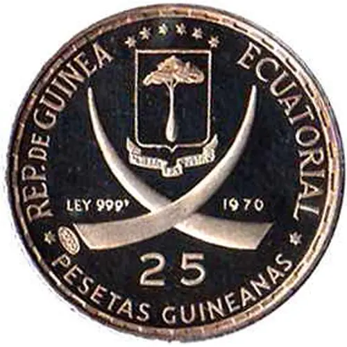 | Chữ khắc mặt trước | REP.DE GUINEA ECUATORIAL LEY 9999 1970 25 PESETAS GUINEANAS (Translation: Republic of Equatorial Guinea .999 Purity 25 Guinean Pesetas) |